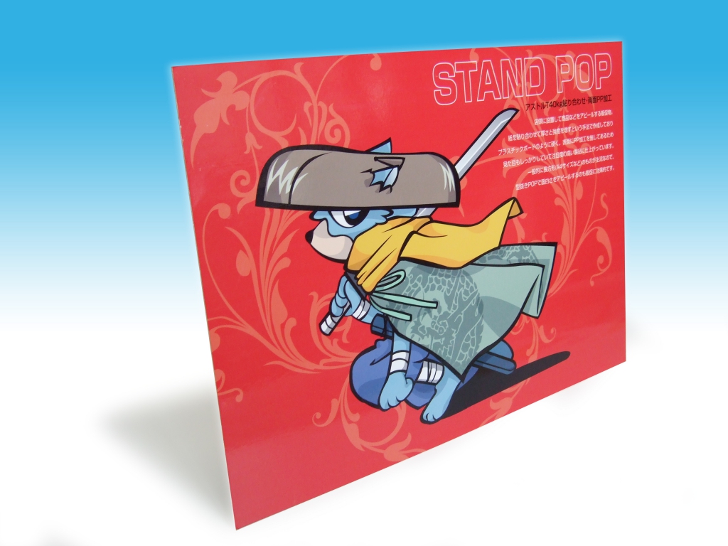 仕様はアストルT40kgを2枚貼り合わせ、さらに両面PP加工をします(紙の厚さは約1mm)。後ろには折りたたみ式の紙脚がつきますので、使わないときにはたたんでスリムになります。仕上げは断裁仕上げ(直角仕上げ)か、角丸や変形での型抜きも可能です。