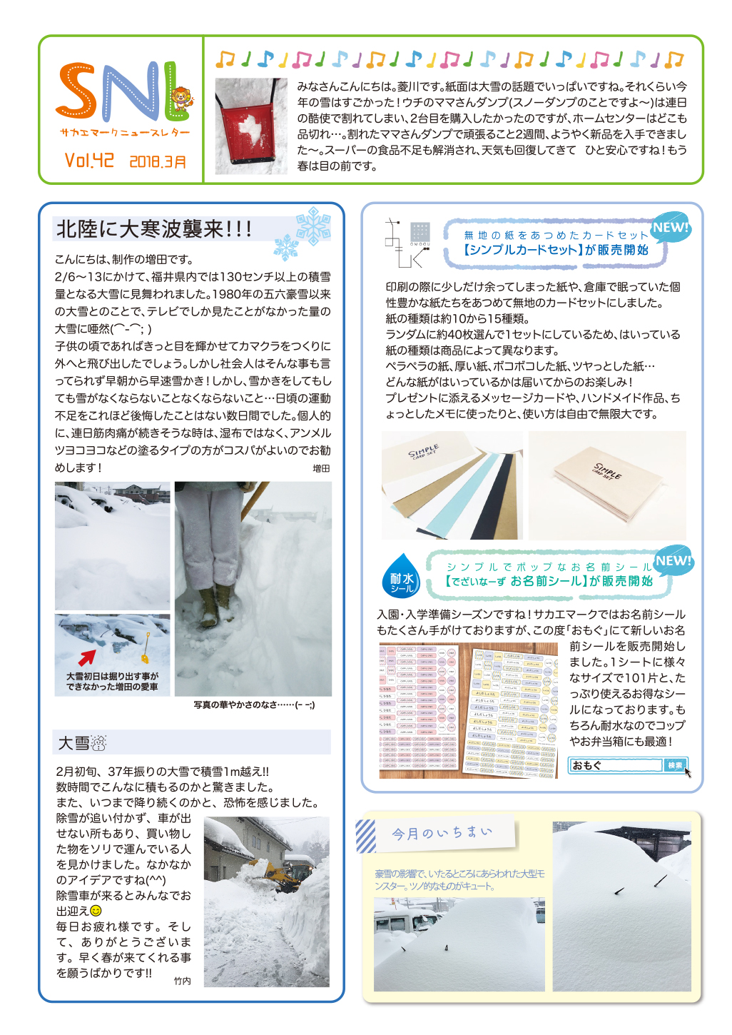 スタッフブログ ニュースレター第42号 2018.03.05 CATEGORY:スタッフブログ みなさんこんにちは! SNLのお時間がやってまいりました。 今月はみなさんよくご存知、2月の大雪特集です! …というのは大げさですが、やっぱり雪ネタが多いですね。(笑) それでははりきってどうぞ〜✨ 我が家もスコップ、ママさんダンプが半壊しました…。 雪の降らない地域に住みたいです…。 それではまた次回! 新着情報 ゴールデンウィーク期間中の休業のお知らせ 下げ札を初めて作る方のための「下げ札入門セット」 RENEW2024開催! インテリアライフスタイル2024 出展ご案内 お客様の声【長野県 M様】 カテゴリ コロナ対策 ここがサカエマーク 企画商品 サカエマークからのお知らせ お客様の声 スタッフブログ アーカイブ 月を選択 2025年4月 (1) 2025年2月 (1) 2024年10月 (1) 2024年6月 (1) 2024年5月 (2) 2024年3月 (1) 2024年2月 (3) 2023年12月 (2) 2023年10月 (6) 2023年9月 (5) 2023年8月 (1) 2023年7月 (2) 2023年6月 (4) 2023年5月 (1) 2023年4月 (3) 2023年3月 (1) 2023年2月 (3) 2022年12月 (3) 2022年11月 (3) 2022年10月 (2) 2022年9月 (1) 2022年8月 (1) 2022年7月 (3) 2022年6月 (3) 2022年4月 (7) 2022年3月 (3) 2022年2月 (1) 2022年1月 (3) 2021年12月 (3) 2021年11月 (3) 2021年10月 (4) 2021年9月 (7) 2021年8月 (8) 2021年7月 (3) 2021年6月 (3) 2021年5月 (5) 2021年4月 (5) 2021年3月 (1) 2021年2月 (9) 2020年12月 (5) 2020年11月 (2) 2020年10月 (6) 2020年8月 (4) 2020年7月 (3) 2020年6月 (3) 2020年4月 (3) 2020年3月 (3) 2020年2月 (1) 2020年1月 (2) 2019年12月 (4) 2019年10月 (3) 2019年9月 (4) 2019年7月 (3) 2019年6月 (6) 2019年5月 (1) 2019年4月 (4) 2019年3月 (1) 2019年2月 (4) 2019年1月 (3) 2018年12月 (9) 2018年11月 (5) 2018年10月 (3) 2018年9月 (3) 2018年8月 (4) 2018年7月 (5) 2018年6月 (92) 2018年5月 (3) 2018年4月 (3) 2018年3月 (2) 2018年2月 (2) 2018年1月 (2) 2017年12月 (1) 2017年11月 (1) 2017年10月 (3) 2017年9月 (5) 2017年8月 (4) 2017年7月 (3) 2017年6月 (3) 2017年5月 (3) 2017年4月 (1) 2017年3月 (2) 2017年1月 (1) 2016年12月 (2) 2016年11月 (1) 2016年10月 (1) 2016年9月 (2) 2016年8月 (2) 2016年7月 (3) 2016年6月 (3) 2016年5月 (4) 2016年4月 (4) 2016年3月 (2) 2016年2月 (2) 2016年1月 (3) 2015年12月 (3) 2015年11月 (2) 2015年10月 (2) 2015年9月 (2) 2015年8月 (2) 2015年7月 (4) 2015年6月 (1) 2015年5月 (2) 2015年4月 (2) 2015年3月 (3) 2015年2月 (3) 2015年1月 (6) 2014年12月 (14) 2014年11月 (13) 2014年10月 (13) 2014年9月 (10) 2014年8月 (6) 2014年7月 (16) 2014年6月 (14) 2014年5月 (9) 2014年4月 (16) 2014年3月 (15) 2014年2月 (14) 2014年1月 (13) 2013年12月 (13) 2013年11月 (16) 2013年10月 (16) 2013年9月 (17) 2013年8月 (12) 2013年7月 (17) 2013年6月 (15) 2013年5月 (16) 2013年4月 (15) 2013年3月 (16) 2013年2月 (9) 2012年12月 (8) 2012年11月 (4) 2012年10月 (5) 2012年9月 (2) 2012年8月 (3) 2012年7月 (4) 2012年6月 (3) 2012年5月 (6) 2012年4月 (6) 2012年3月 (9) 2012年2月 (3) 2012年1月 (8) 2011年12月 (9) 2011年11月 (15) 2011年10月 (20) 2011年9月 (22) 2011年8月 (23) 2011年7月 (20) 2011年6月 (2) 2011年5月 (3) 2011年4月 (1) 2011年3月 (3) 2011年2月 (3) 2011年1月 (3) 2010年12月 (5) 2010年11月 (7) 2010年10月 (11) 2010年8月 (1) 2010年7月 (4) 2010年6月 (2) 2010年5月 (2) 2010年4月 (4) 2010年3月 (1) 記事検索