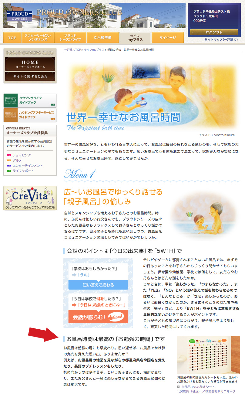 会員向けなので一般の方は見ることができないのですが、「世界一幸せなお風呂の時間」という特集ページに「お風呂時間は最高のお勉強の時間」として我が社のお風呂で九九覚えシートを紹介していただきました。