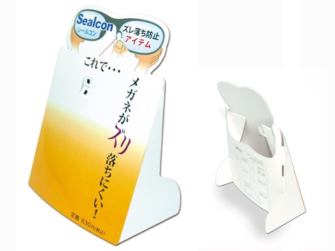 眼鏡の鼻当ての部分に貼るシリコンシールのディスプレイです。シリコンシール自体が透明でアピールしにくいものだったので、立体のディスプレイを提案しました。