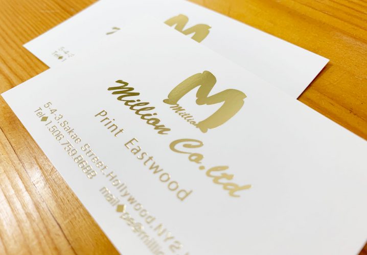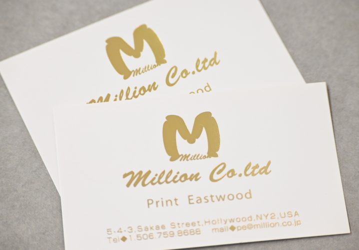 金箔押しをした名刺です。箔押しは金だけではなく、銀はもちろん白や黒、レインボーなどもあります。箔押しはお菓子の箱やシールなどでよく見かけますが、名刺に使っても十分インパクトが出ます。