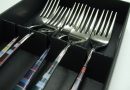 フォークは平置きにするとどうしても横のサイズが広がってしまうため、切れ込みの深さを浅いものと深いものの2種類にし、上の段に2本、下の段に3本と重ねるように配置。これで従来よりもかなりサイズダウンができ、柄の先を穴に差し込むことによりしっかり固定ができました。