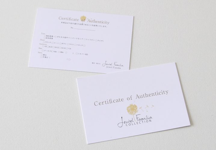 Jewel Familia様からご注文いただきました、アクセサリーの品質保証書です。