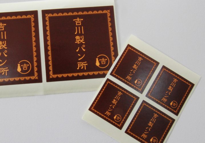 吉川製パン所様からご注文いただきました、商品シールです。 大(60×60mm)と、小(30×30mm)サイズの2種類を作成しました。 レトロな感じを出したいとの要望をいただきデザインから印刷まで手掛けました。 結果、イメージ通りの仕上がりだとのお声をいただきました。