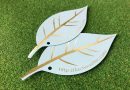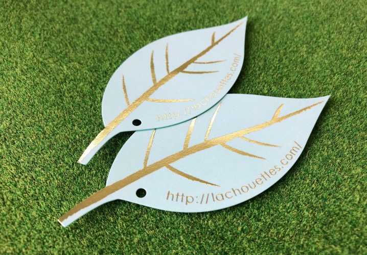 ケンラン225kg キラアサギという特殊用紙に箔押し加工を行い、葉っぱの形に変形型抜きを行ないました。