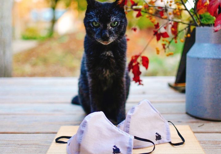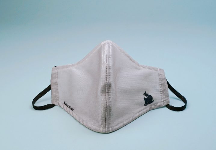 ノロショップ様こだわりの、日本人の肌色のトーンに近くさり気なく使えるグレーカラーに可愛い黒猫のノロちゃんがモデルのワンポイントイラストがさりげなく入った使いやすいマスク。