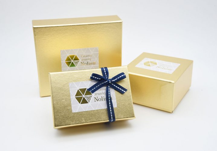 Nolism様より焼き物のアクセサリーを入れるプレゼントBOX用の箔押しシールをご注文いただきました。