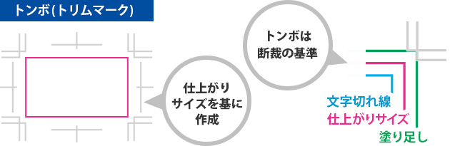 トリムマーク(Trim Marks)は、印刷物の製作過程において切断の基準となるマークです。通常、印刷物の四隅に小さな線や十字の形で配置され、カットライン(切断線)を示します。これにより、印刷物が正確に切り取られて最終的なサイズに仕上がることが保証されます。