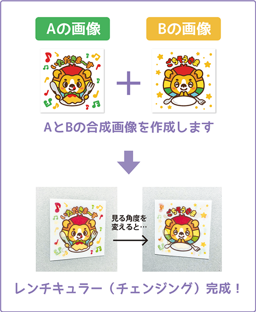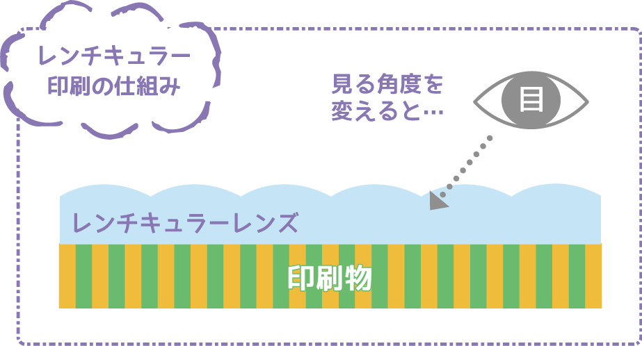 特殊なレンズと左右の目の視差を利用することで、見る角度を変えると絵柄が変化しているように見える不思議な印刷です。