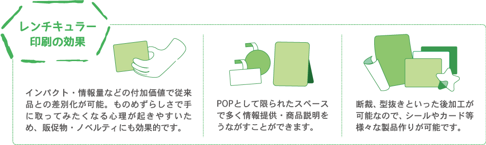 レンチキュラー印刷は通常の印刷物同様に、断裁・型抜き・その他印刷後の様々な加工に対応しております。販促物やノベルティなどに使える、バラエティに富んだアイキャッチ効果抜群の製品づくりが可能です。