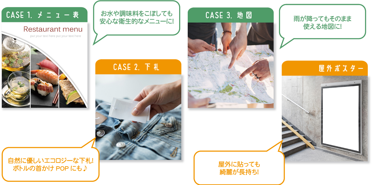 他にも、名刺・横断幕・POP・パッケージ・チラシ・冊子・紙袋・ラベル・シールなどなど、様々な商品に使用できます!