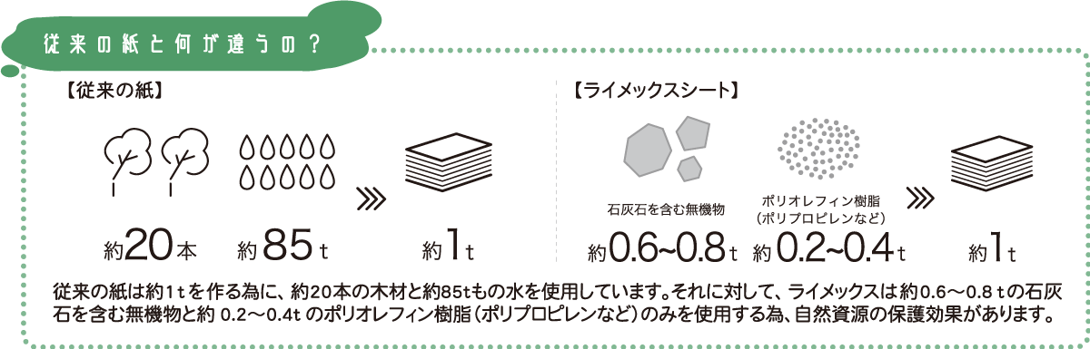 従来のパルプ紙や合成紙とは異なり、木材や水をほとんど使用せずに製造されるため