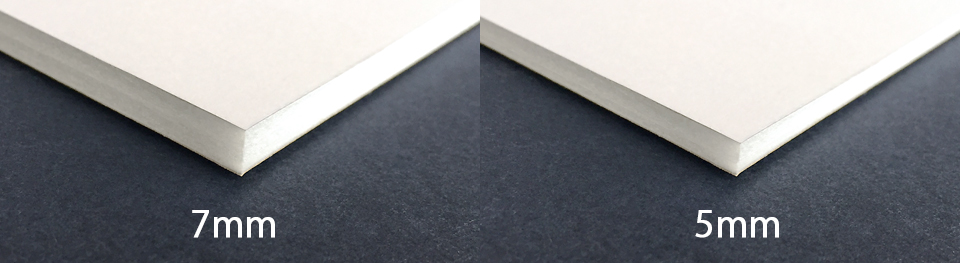 パネルの厚みは5mmと7mmの2種類があります。パネルはその性質上、若干反ってくる場合がございます。比較的サイズの小さいもの(A2ぐらいまで)は5mmでも大丈夫ですが、それ以上の場合は7mmの方をおすすめします。