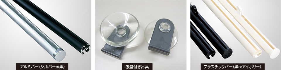 ※アルミバーの場合は吸盤付き吊具が2個(吸盤は取り外し可能)、プラスチック製の場合はフックが2個付属されます。