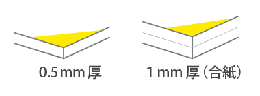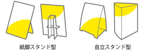 紙脚付スタンド型の場合、アストルT40kgを使用します。この用紙は厚みが約0.5mmありしっかりしています。さらにこれを2枚貼り合わせた1mmタイプもございます。コストはあがりますが、その分強度・重みが増します。 自立スタンド型の場合はアストルT22.5kgを推奨していますが、それ以外の用紙も使用可能ですのでお気軽にご相談ください。