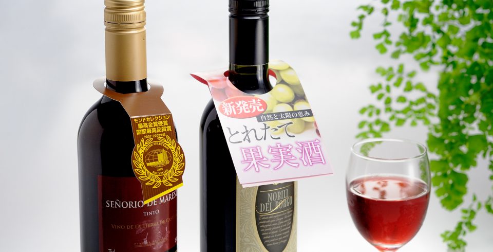 ワインの瓶やペットボトルなど、色んな容器の首に掛けるタイプのPOPです。