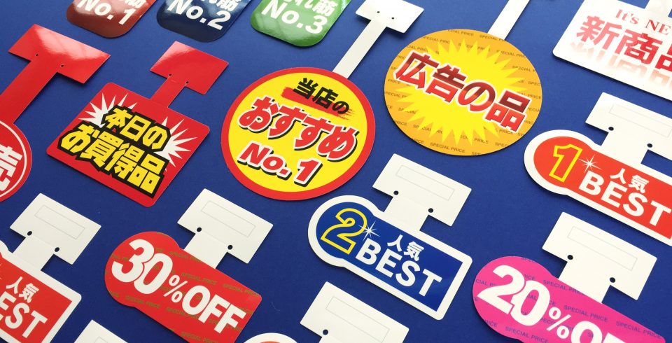 コンビニなどで新商品や売れ筋の商品の棚に貼ってあることが多く、人が通ったりちょっとの風でもユラユラ揺れるのでアイキャッチ効果がバツグン!