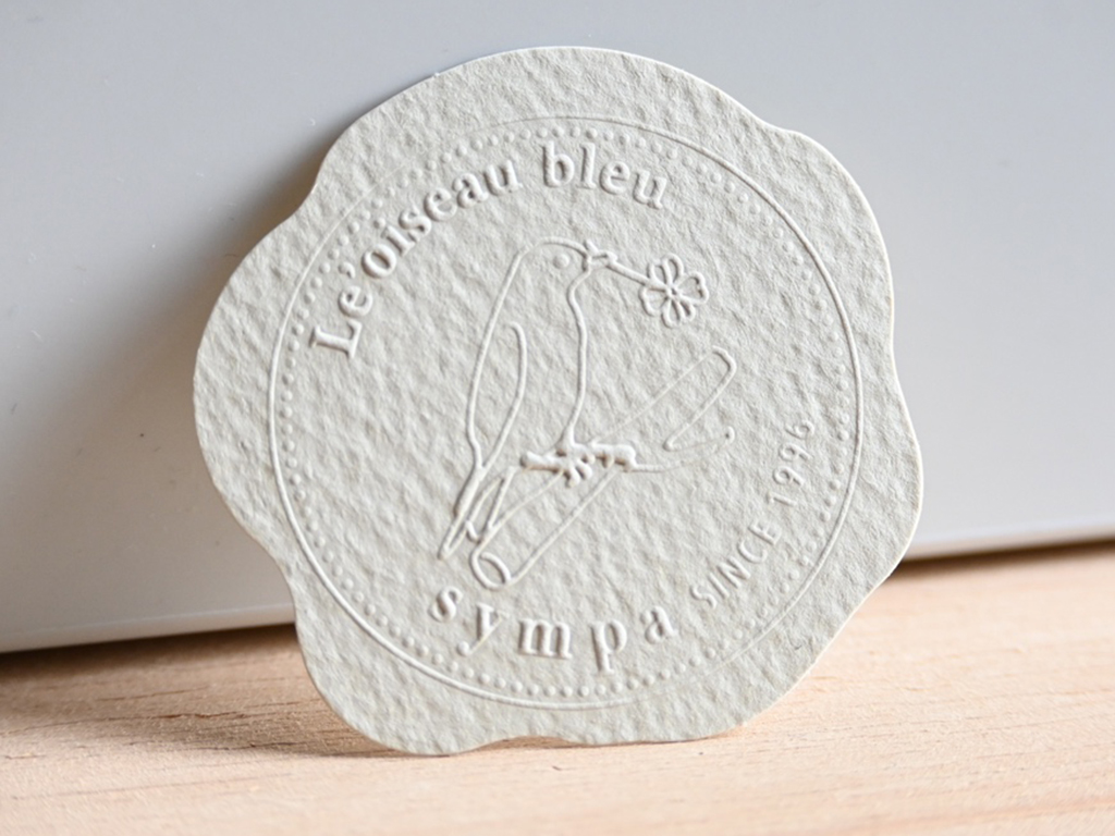 エンボス加工は別名「浮き出し加工」ともいい 、マグネシウム製の凹版と樹脂製の凸版で紙を挟むことによって凹凸を生み出す加工です。