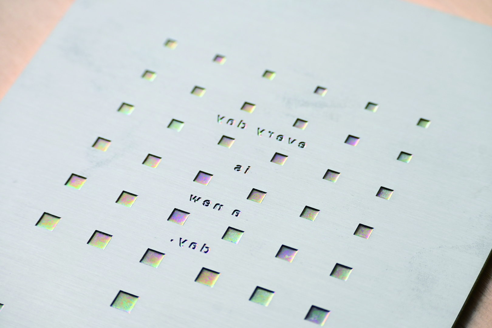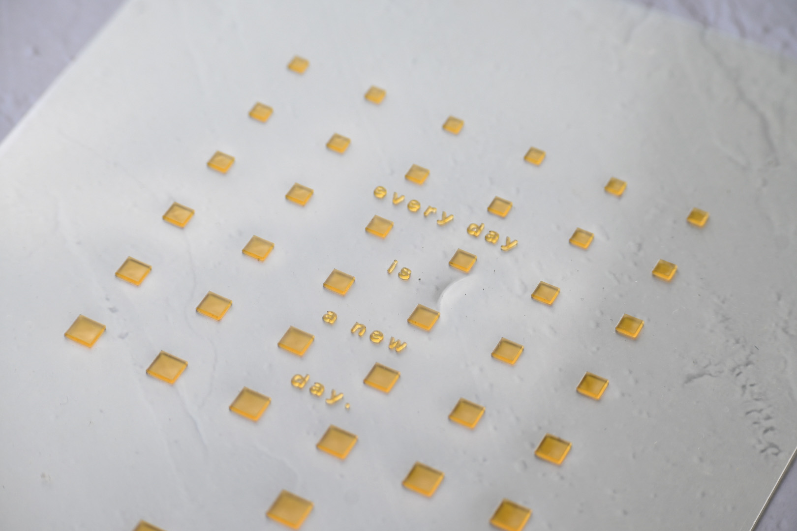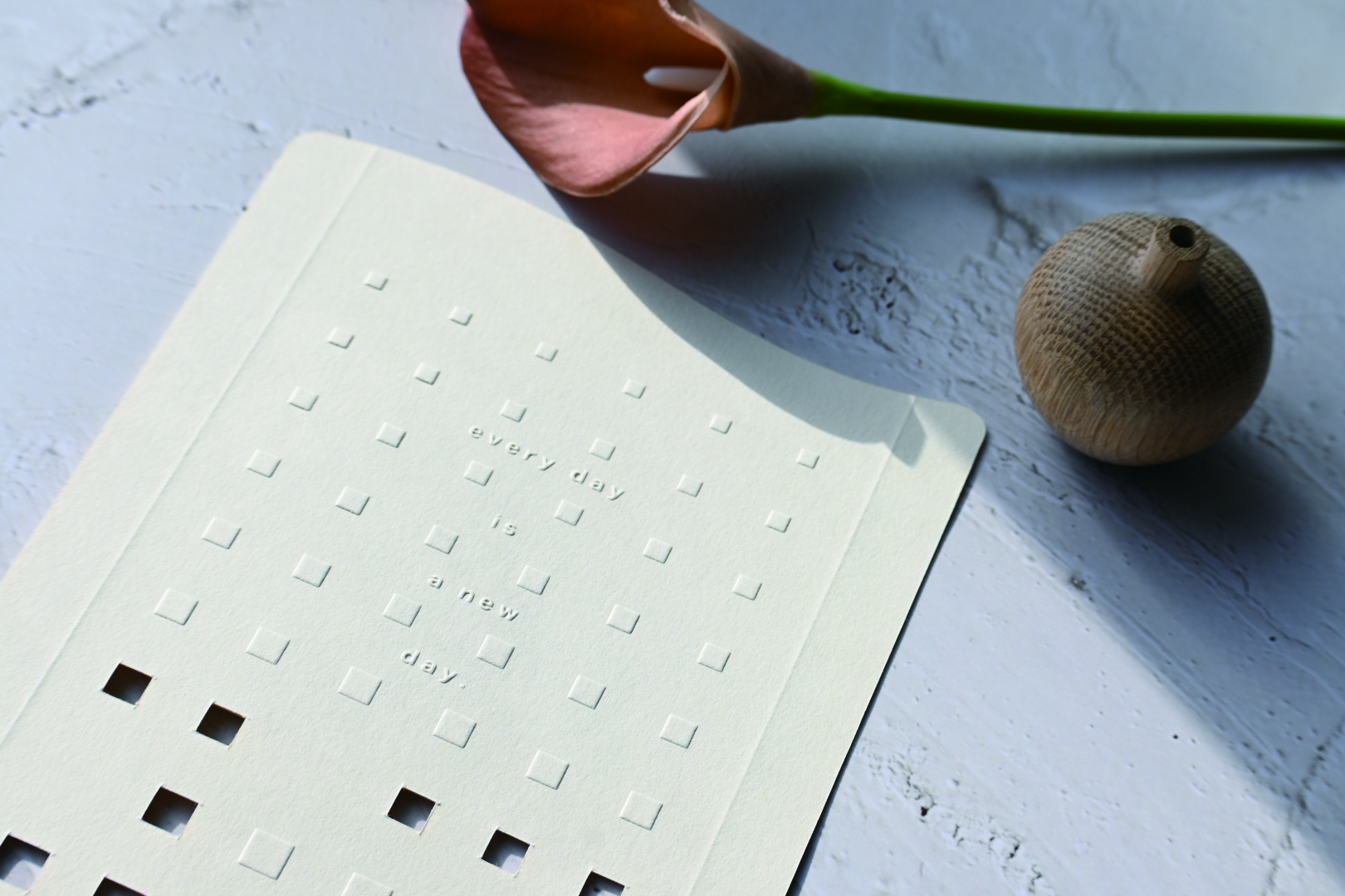 エンボス加工は別名「浮き出し加工」ともいい、マグネシウム製の凹板と樹脂製の凸版で紙を挟むことによって凹凸を生み出す加工です
