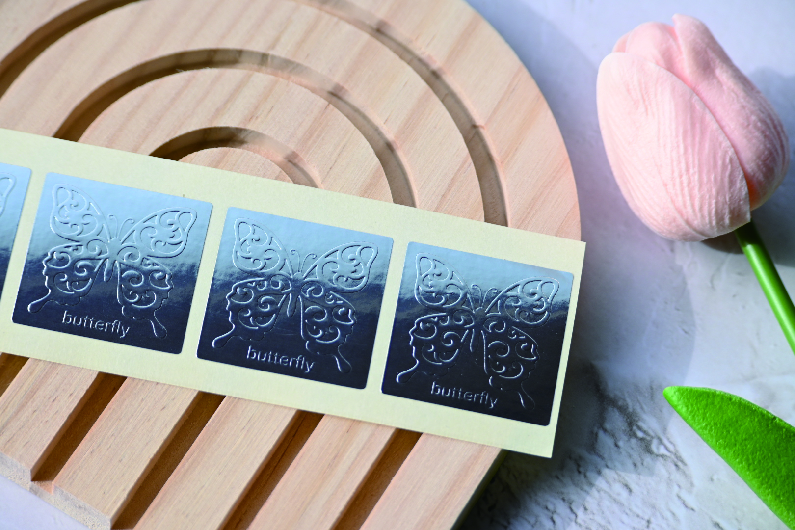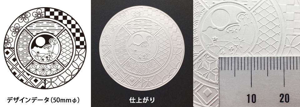 エンボスは箔押しのようにかすれたり、埋まってしまうことはあまりありません。このような細かい複雑なデザインでも表現できます。ただし、紙が厚くなるほど表現が難しくなります。※画像はシールの上質紙(90μ)の場合。
