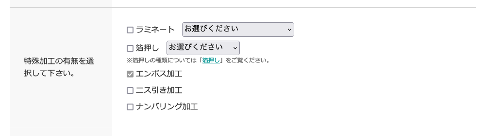 エンボス加工のお見積は各商品ページの「かんたん見積」のところで「エンボス加工」の項目にチェックを入れてご確認ください。