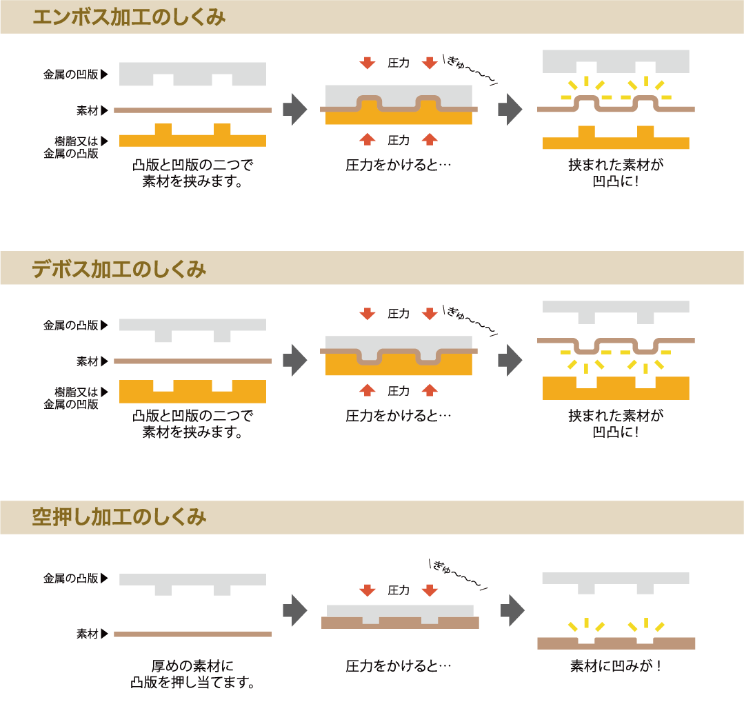 エンボス加工・デボス加工・空押し加工のしくみ