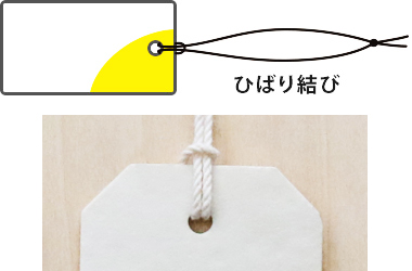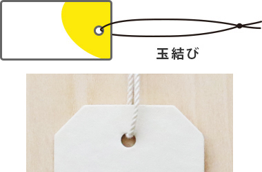ひもの結び方は2通りあり、通常は「玉結び」で通しますが「ひばり結び」でも対応可能です。ひばり結びの場合は完全手作業となるため時間がかかりますが、タグが回転しにくいという特徴があります。