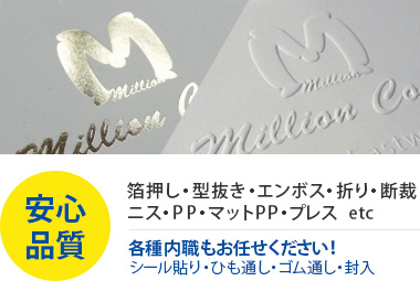 弊社では、箔押し加工やエンボス加工、ニス引きやPP加工など、色々な加工を行っております。人気の活版印刷なども、どちらかというと加工に近い形となります。このような加工は、形やサイズ、紙によって与えられた下げ札・タグの印象をより引き立たせる効果を得ることができます。紙との相性などもございますので、特定の加工をご希望の場合は、相談時にどのような加工をしたいかお教えください。その上で、ご提案をさせていただきます。