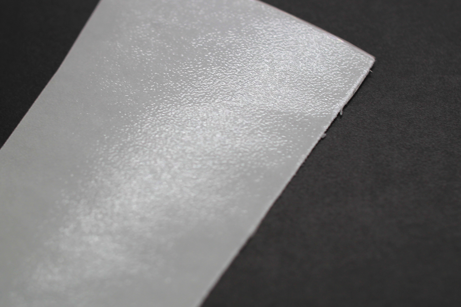 ユポの強粘再剥離というタイプのシールにエンボスラミネートというざらざらした手触りのラミネートを貼っています。