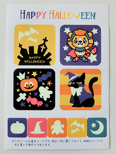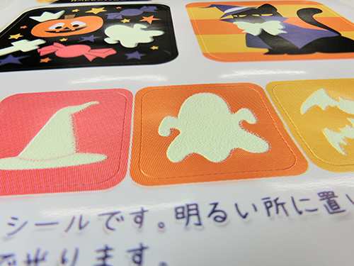 ハロウィンらしい可愛らしいシールを蓄光印刷で怪しく光らせる…う〜ん!素敵!