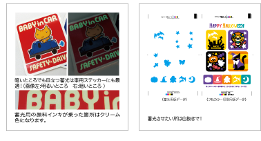 専用の顔料インキを使用するため、蓄光部分には色や柄は印刷できません。そのため、蓄光させたい箇所は白抜きの状態でデータを作成する必要があります。