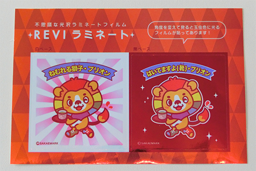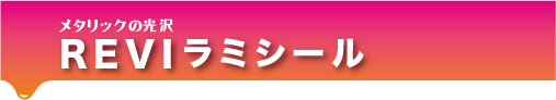 独特の色彩変化とメタリック調の風合いが楽しい不思議なラミネート。通常のシール印刷の上に貼る透明ラミネートの代わりにREVIラミネートを施すと、全く違ったテイストのシールが完成!
