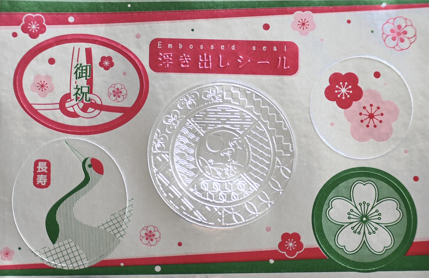 ツヤあり・なしの金銀両方のホイル紙に弊社で加工可能なギリギリのデザインで作成したエンボス加工シールのサンプルです。