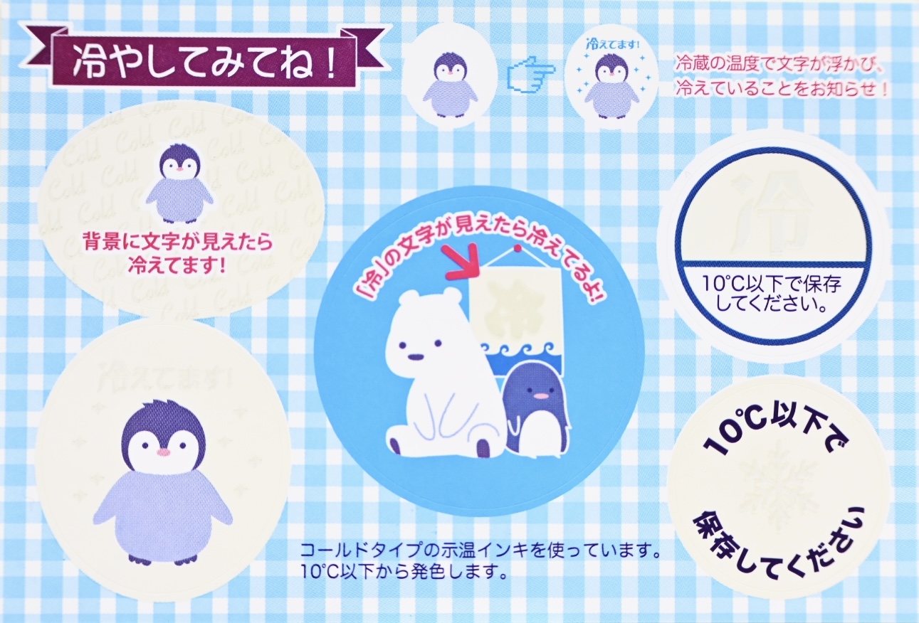感温(適温)シールのサンプルです。使用した示温インキは冷蔵庫などで冷やしたときの温度変化を想定した「コールドタイプ」で、10度以下になると示温インキに反応がおきて色が浮かび上がってきます。