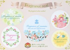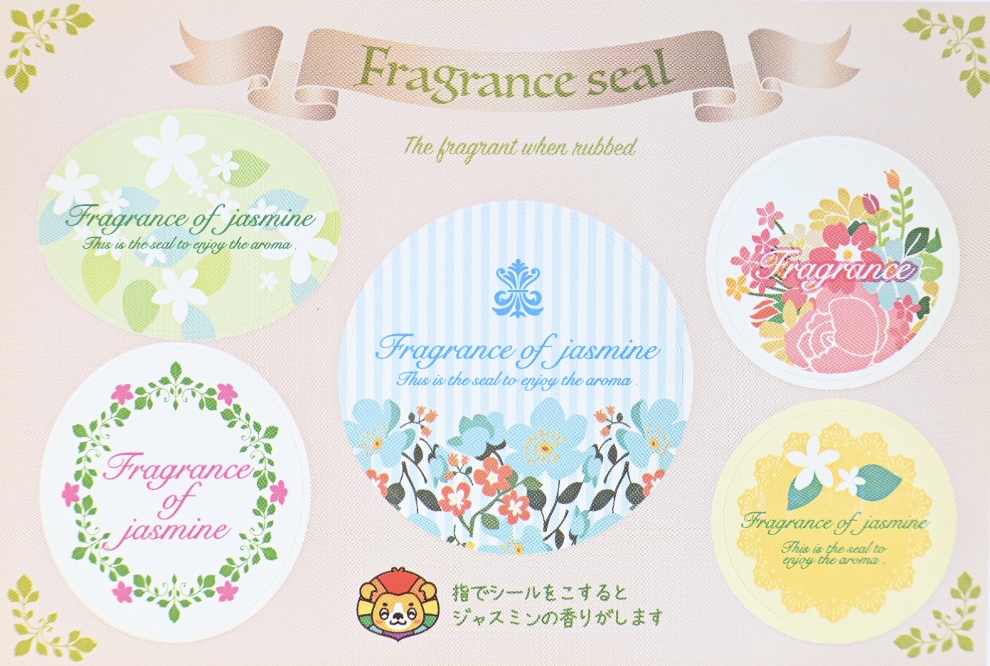 香り成分を閉じ込めたとても小さなカプセルが入っている透明なインクを印刷物の上から印刷したものが、香り印刷と呼ばれるものです。このサンプルはジャスミンの香りのインキを使用しています。