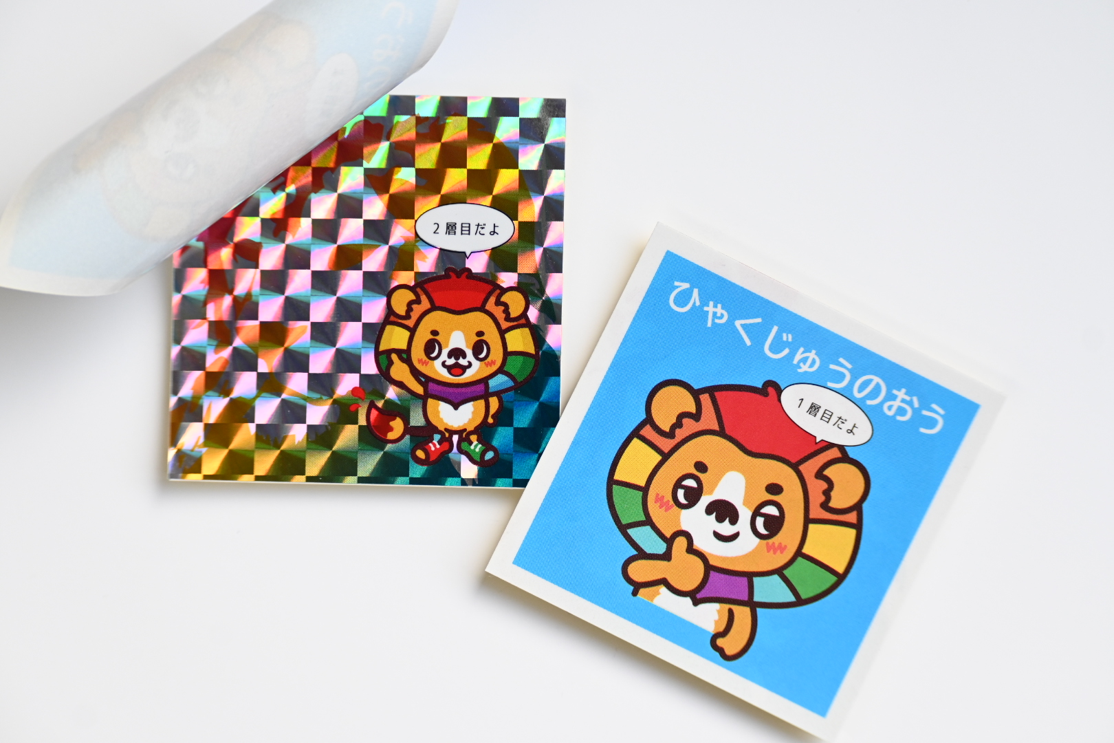 弊社で使用している販促用ノベルティー(おまけ)シールです。180x148mmのサイズのシートタイプのシールで、56箇所のハーフカットが入っています。