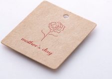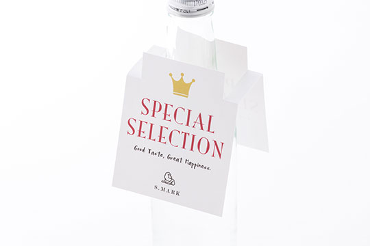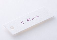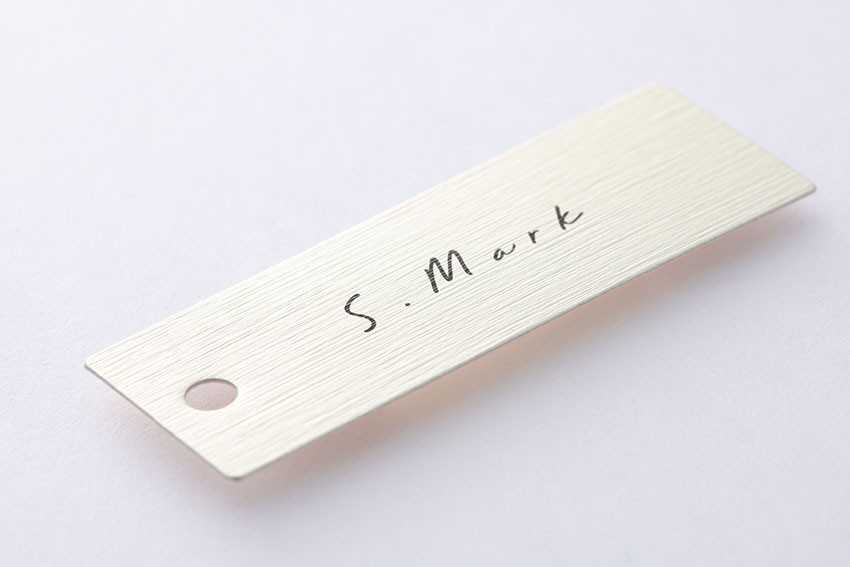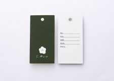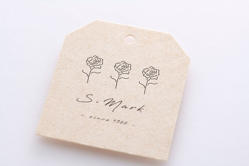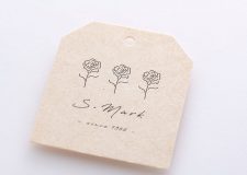 当社のテンプレート(ST-02)を使用したサンプル下げ札です。TOマットNは表面の質感がしっとりとしたマット紙で、シンプルなデザインにも落ち着きのある高級感を出してくれます。