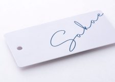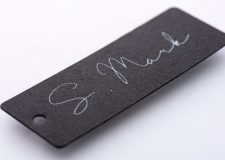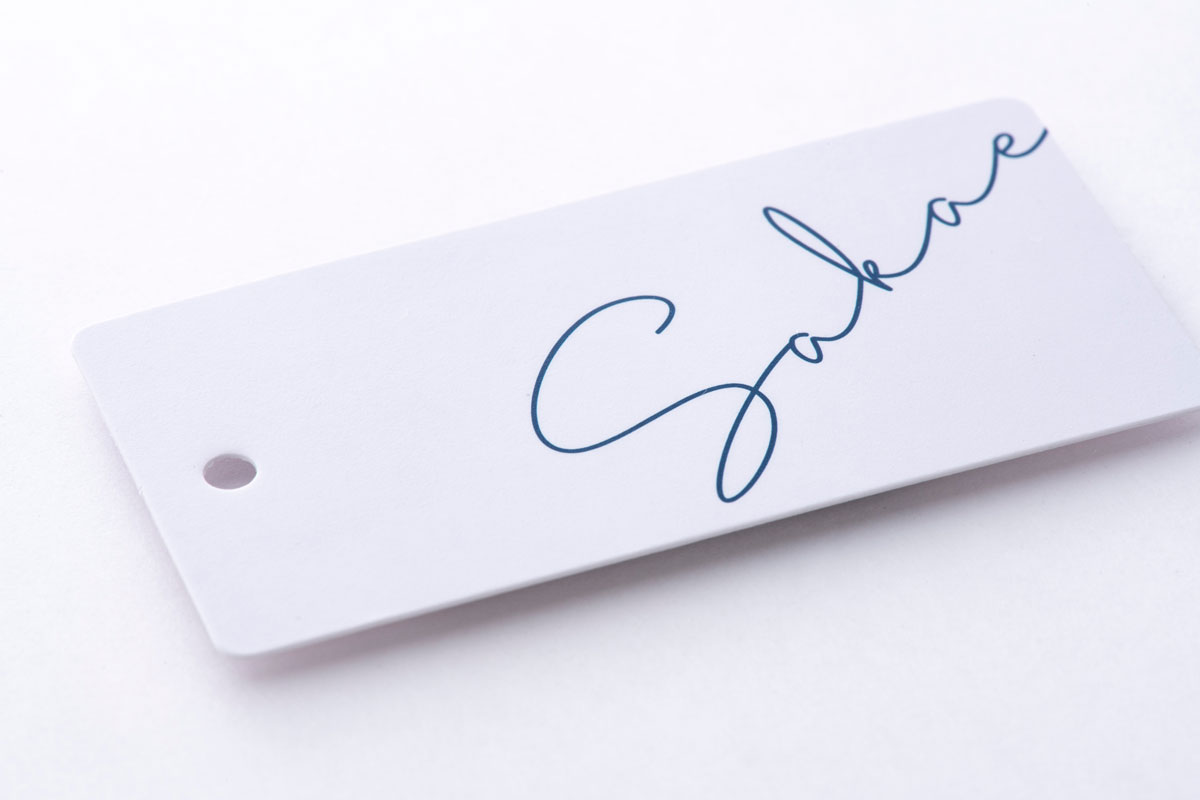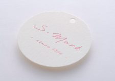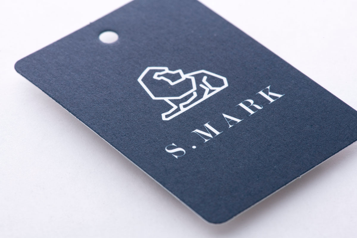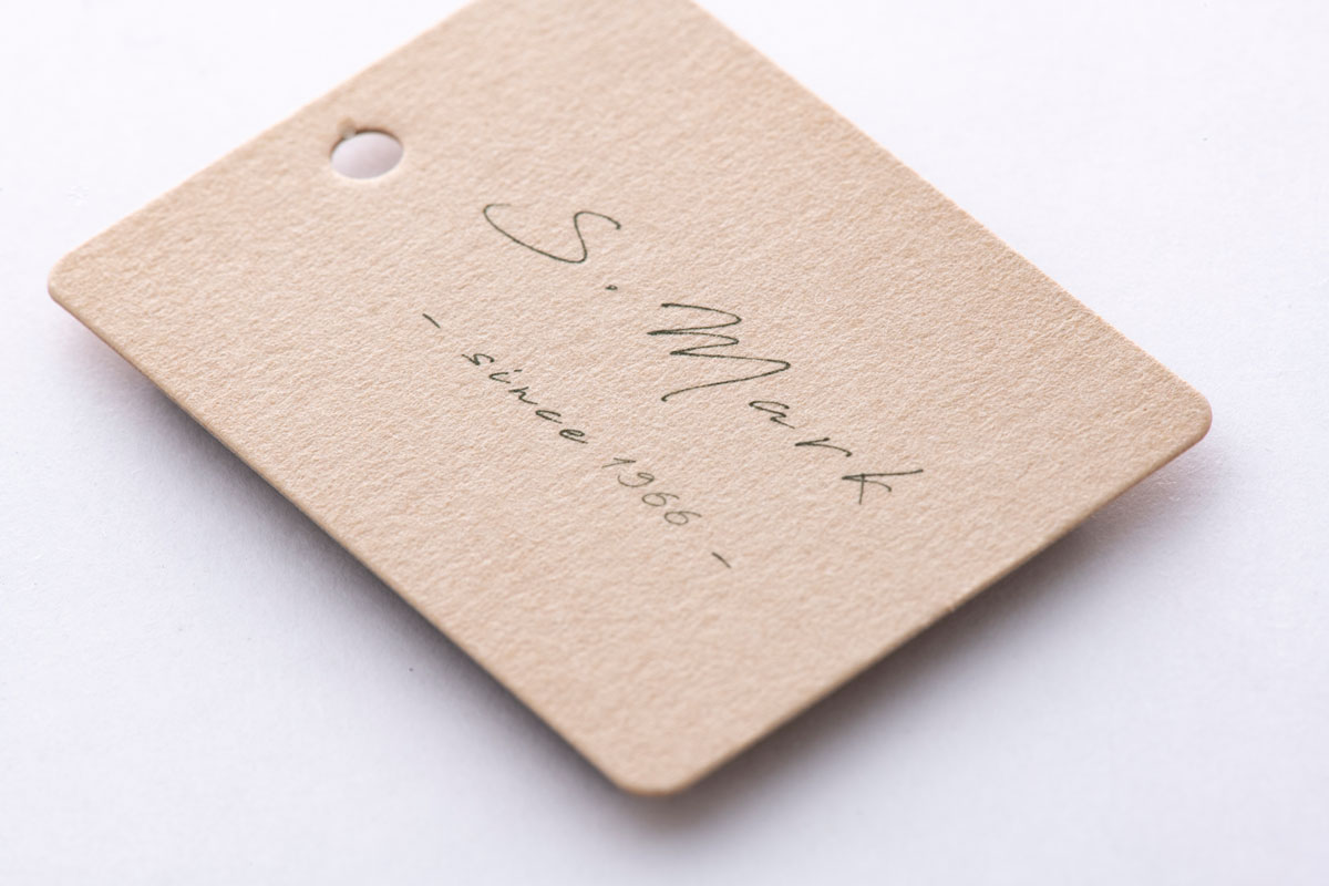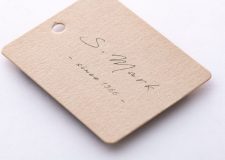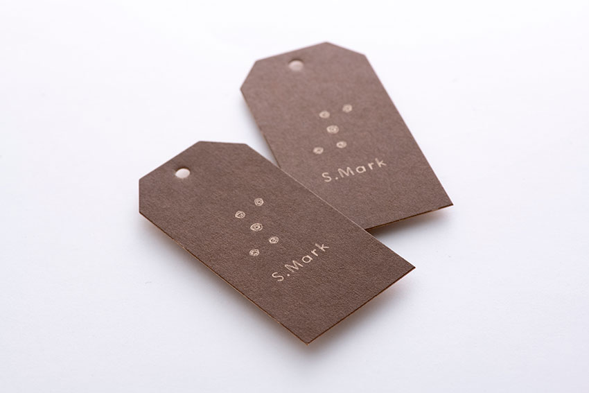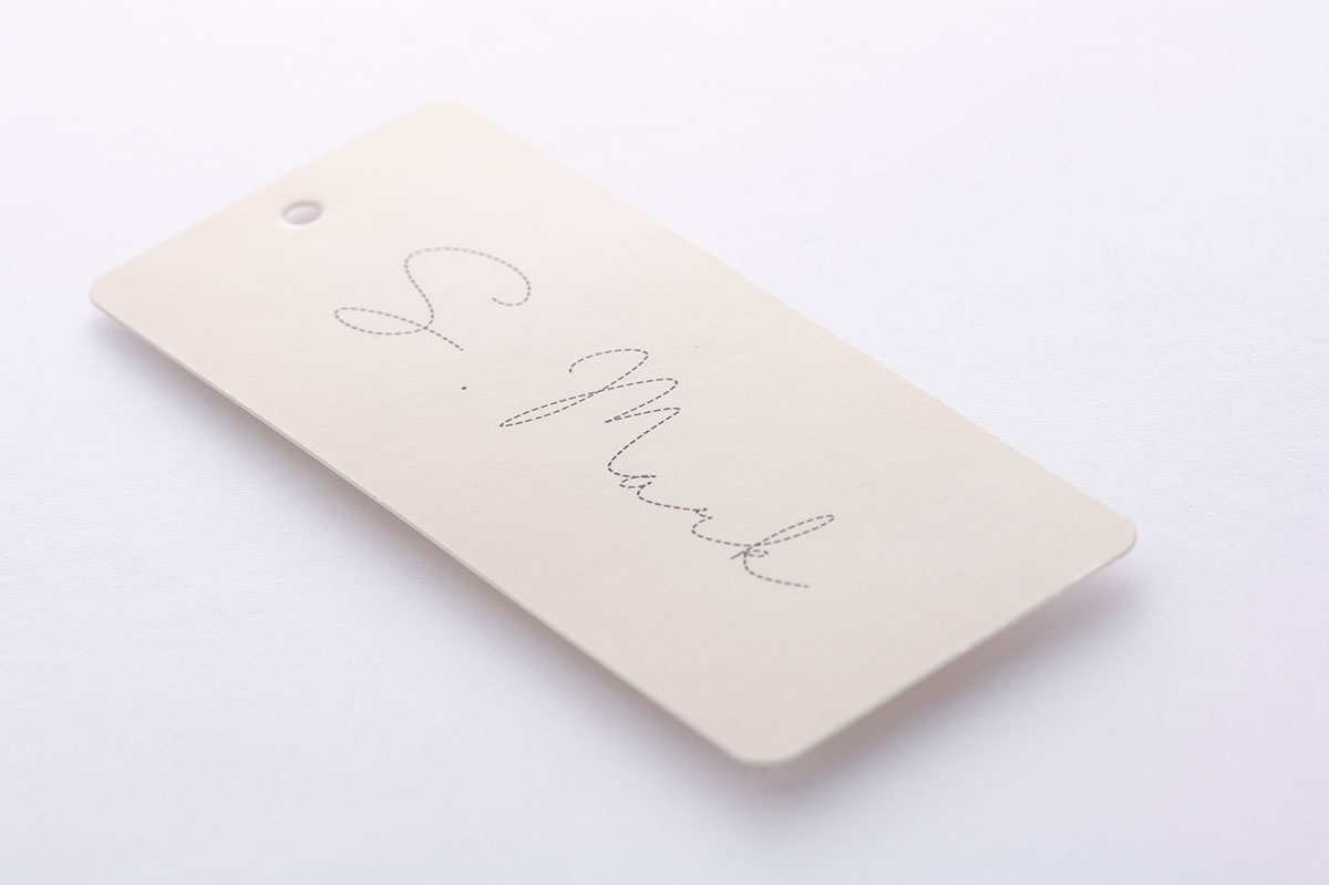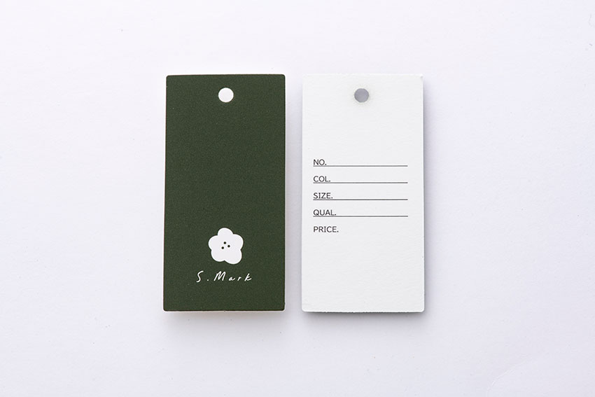 当社のテンプレート(ST-06)を使用したサンプル下げ札です。エスプリコートはオモテとウラとで質感が違う用紙なのでブランドタグにオススメの用紙です。