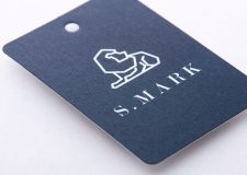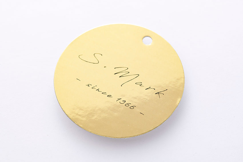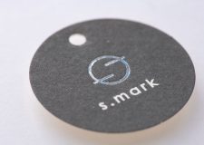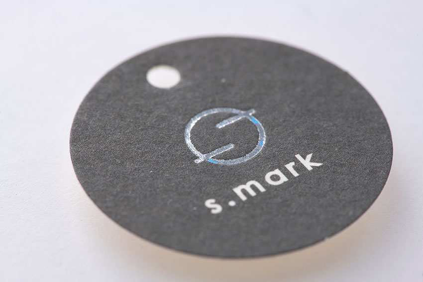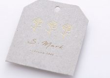 当社のテンプレート(ST-15)を使用したサンプル下げ札です。マーメイド 白の用紙に、グレーのベタ印刷を行いロゴ部分はホログラム箔で仕上げました。