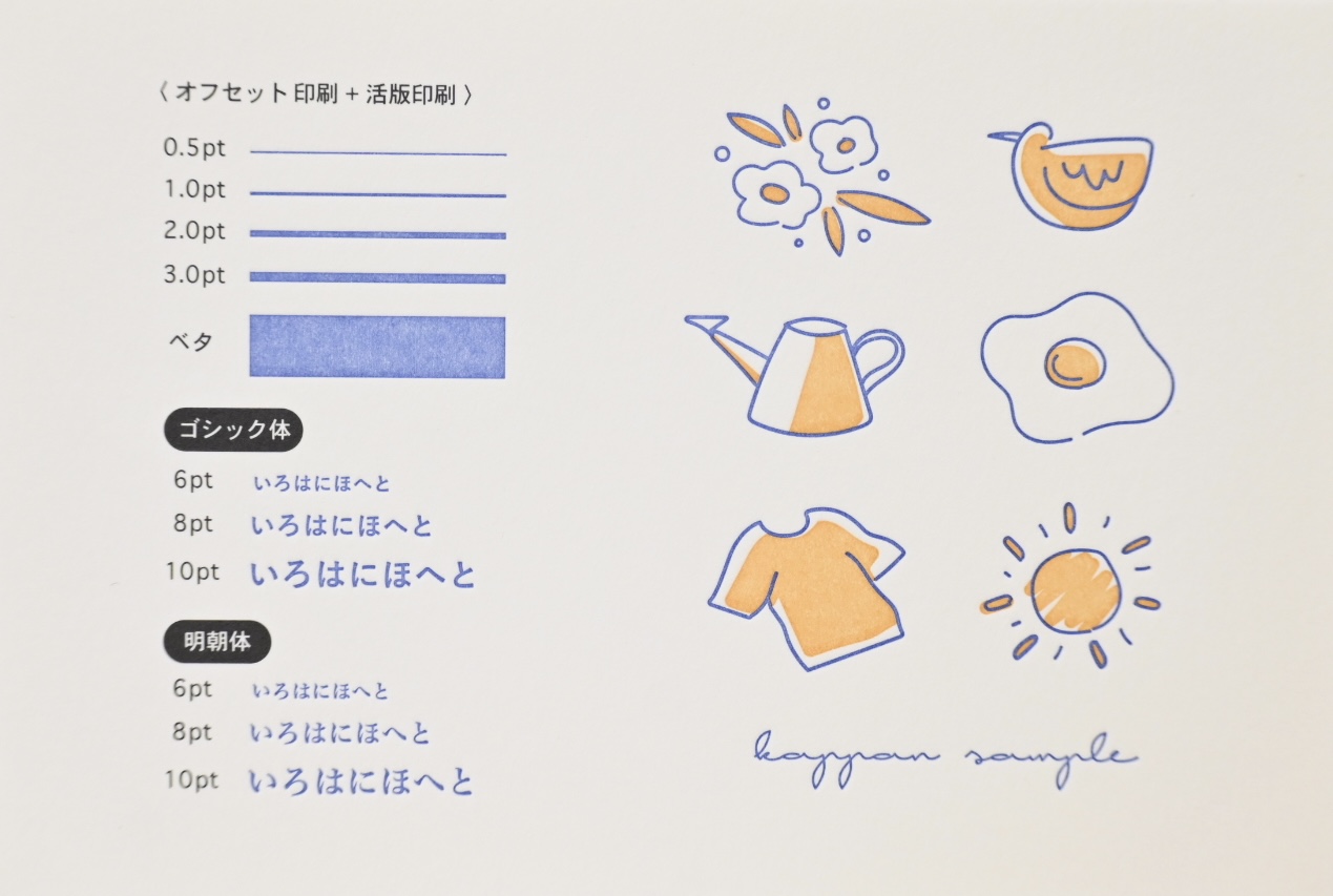 青とオレンジの2色のインキを活版印刷しました。活版にオススメの特Aクッション紙を使用しており、用紙の質感や活版のベタの仕上がりを確認したい方にオススメです。